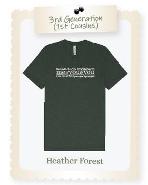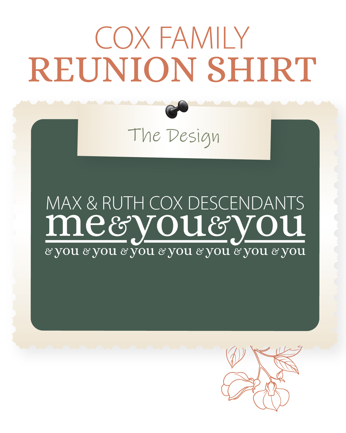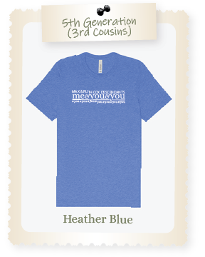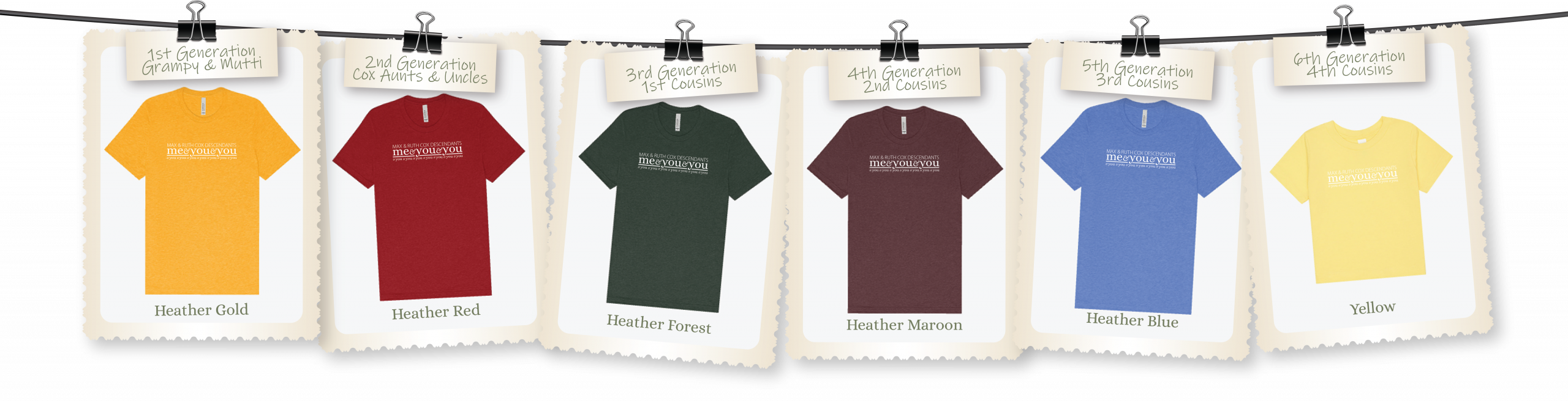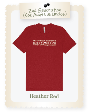 We want everyone in the family to have a shirt, whether you’re able to attend the reunion or not. No cost should stand in the way—just submit your size through the Reunion RSVP page so we can include you.